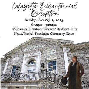 The reception will take place in historic parlors restored to their appearance when Governor Schulze hosted Lafayette on February 1, 1825. Festive hors d’oeuvre, champagne, and aperitifs will be served. Music will be available as well as tours of the McCormick Riverfront Library. Period Early American or French Attire is encouraged but not required.