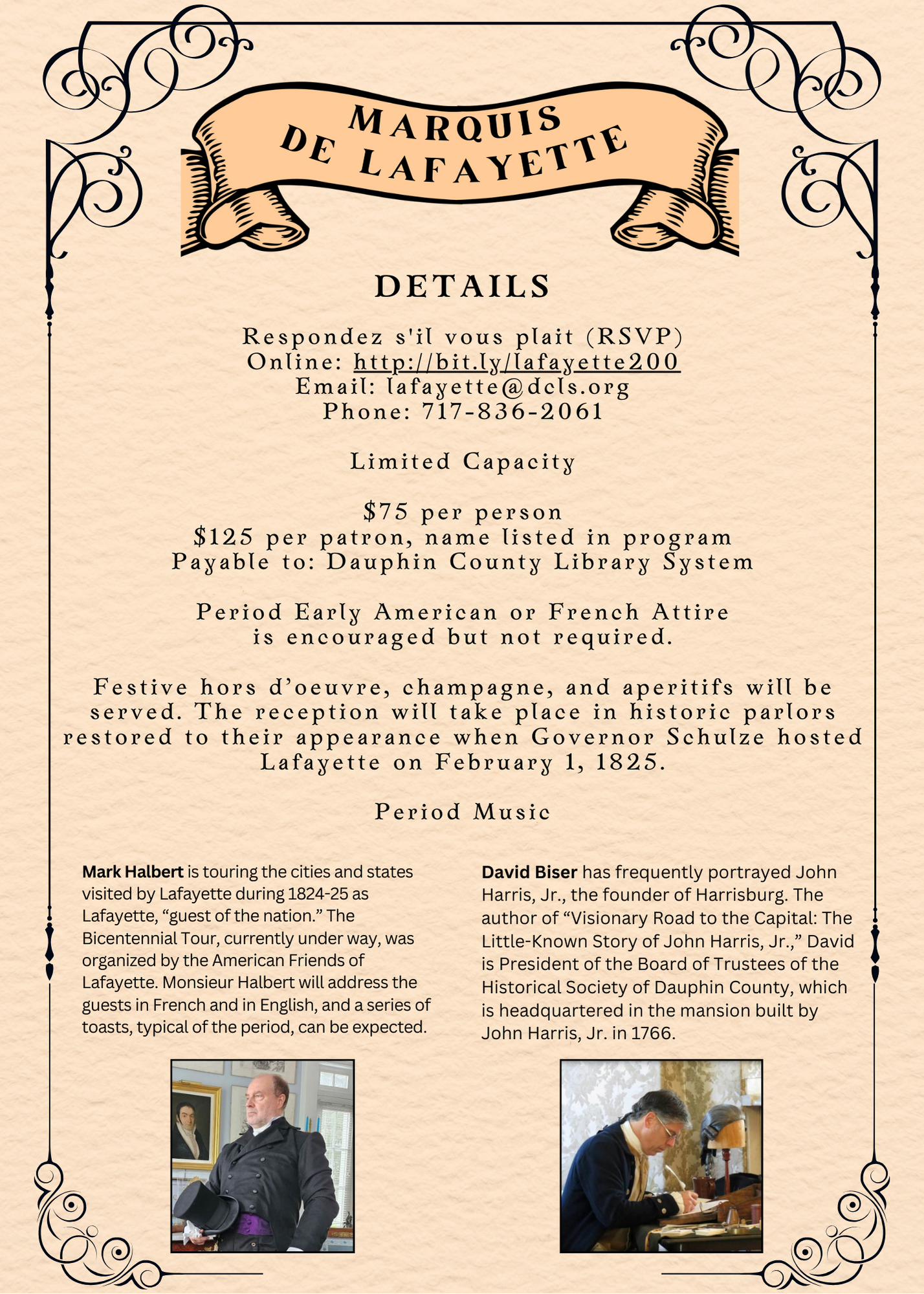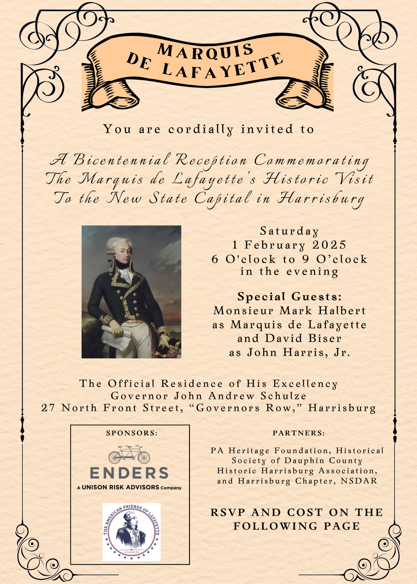 You are cordially invited to a Bicentennial Reception commemorating the Marquis de Lafayette’s historic visit to the new state capital in Harrisburg.