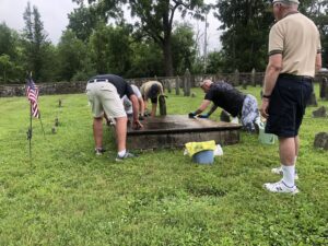 Ten people volunteered to clean and another four stopped out to talk, hear about the process, and share history on the cemetery. About fifty stones of all veterans buried here were cleaned using D2 Biological Solution (a specialized chemical specifically made for safely cleaning old stonework from years of natural growth); this included a few from the French & Indian War, over 44 from the Revolutionary War, and a few from the Civil War.