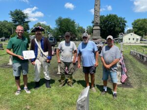 Pictured here is President Lemon in Continental Army uniform along with Andy Gingrich of Gingrich Memorials, as well as the grounds crew John, Ed, and Steve that work tirelessly at this cemetery year round, maintaining respectful condition of the cemetery and of course the U.S. Flag. Photographed by Deb, she runs the office and has organized historical records for the cemetery for years. Lemon read the following proclamation.