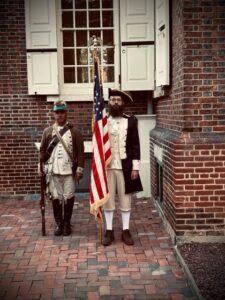 The tour of Carpenter’s Hall was well attended; the staff and local Park officials informed visitors of many intricate details to aspects of the building, the meeting of the rebels, as well as why they chose to meet there. The 250th Anniversary ceremony was hosted by the Pennsylvania Society SAR and the Philadelphia Continental Chapter SAR. Members of the state societies from the original thirteen colonies, including George this time, were in attendance. The beautiful weather from earlier in the day continued throughout the presentation of wreaths, the ceremony, and Color Guard performance. The event was open to the public and attended by several bystanders.