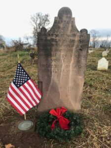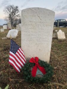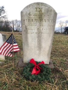 After an afternoon of intense weed-wacking and cutting, Prowell’s Cemetery looked itself once more. Two more veterans were identified alongside Revolutionary War Patriot William Prowell: John S. Singer (War of 1812) and Hiram Hants (Civil War). All three veterans received flags and holiday wreaths (a side project Compatriot Lemon does for local veterans at small and abandoned cemeteries in the area).
