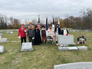 President Lemon conducted the ceremony and led the Color Guard, which consisted of Washingtonburg compatriots. The ceremony was well received and was also accompanied by Marine Corps League member Tony on the Bugle to play Taps. Harris Ferry’s Coburn and Boyarski were in attendance. Washingtonburg’s Leppard, Troutman, Mowery, Beaver, Dyckman, and Ptaszek served in the Color Guard, and compatriot Scarazzo was also in attendance. Carnations and flowers beautifully decorated Smith’s grave following the ceremony.